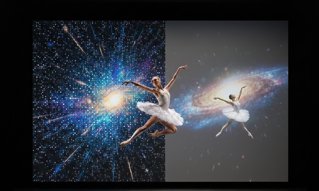 Para congelar os movimentos de uma apresentação de teatro ou dança sem borrões, o equipamento fotográfico precisa operar em altíssima velocidade. Nesta fração de segundo, a câmera captura o telão de LED em seu estado bruto de emissão de luz. Caso tentássemos remover o efeito do LED durante o clique, o resultado seriam artistas desfocados ou com movimentos “fantasmagóricos”.